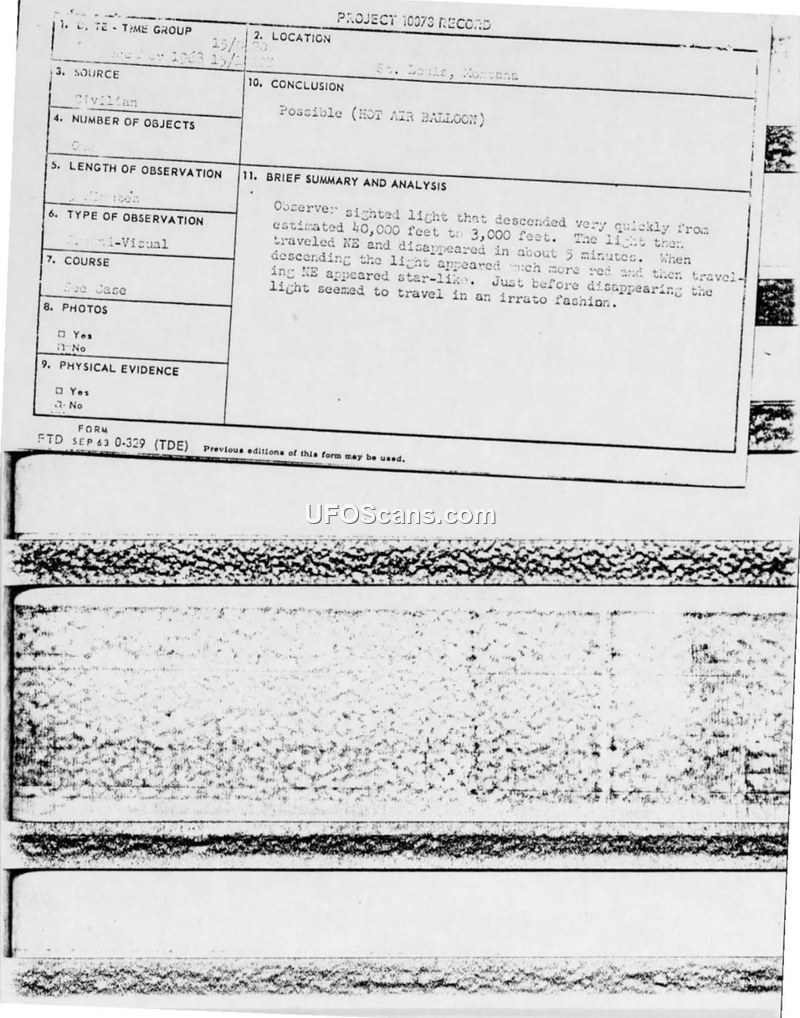 A former Air Force member reported a silent, rapidly descending, color-changing light over St. Louis, Montana, on December 15, 1968. The Air Force officially categorized the incident as a possible hot air balloon.