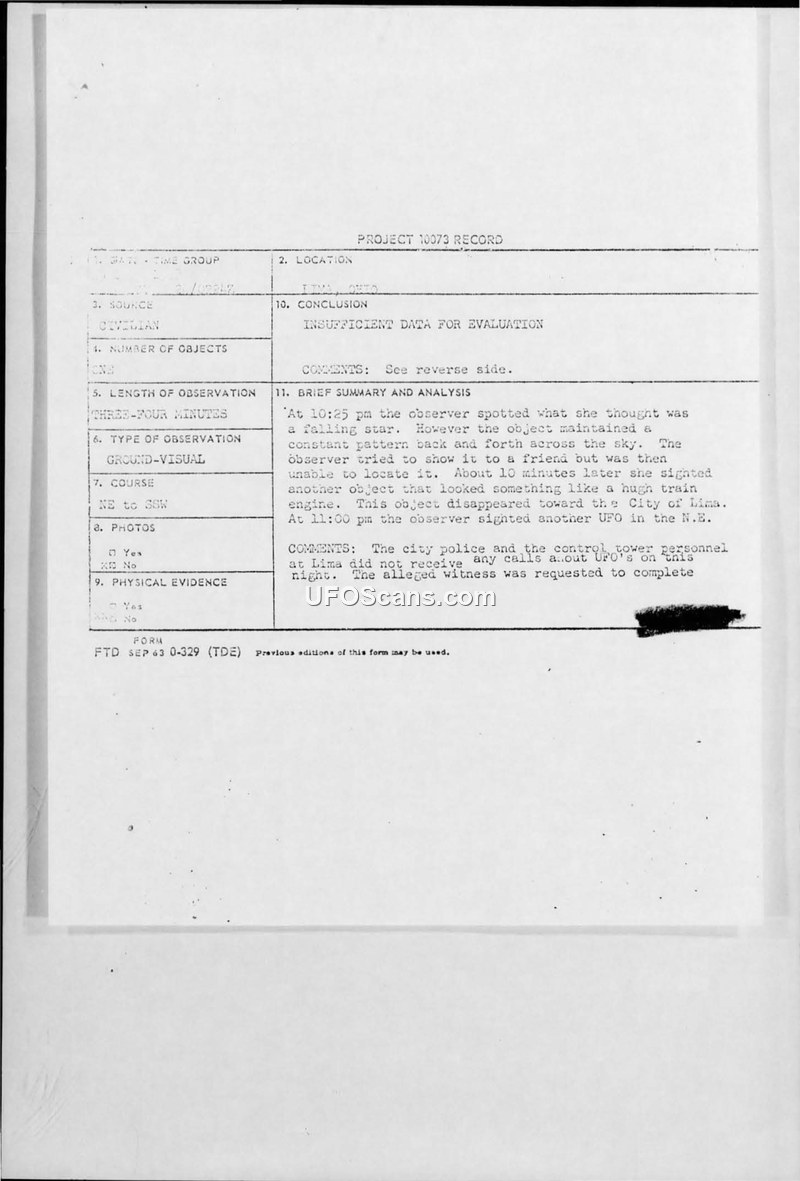 The Air Force concluded there was insufficient data to evaluate the sighting. The Lima Police Department and Lima Airport reported no knowledge of any UFO sightings in the area during the period.