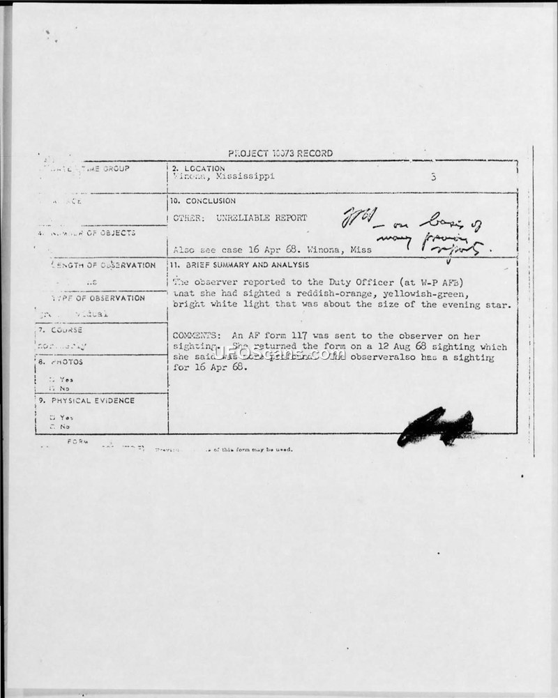 Project 10073 Record — UFO Observation, 1 August 1968, Winona, Mississippi