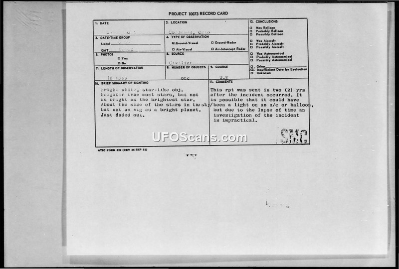 A Project 10073 record card documenting a 15-minute sighting of a star-like object in Columbus, Ohio. The report was filed two years late, rendering a formal investigation impractical.