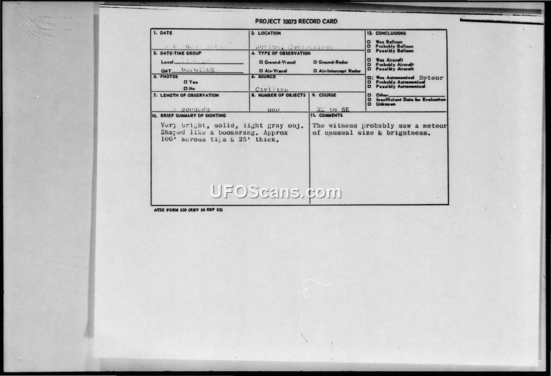 A physicist reported a boomerang-shaped UFO in Connecticut in 1958. The Air Technical Intelligence Center concluded the object was a meteor of unusual brightness.