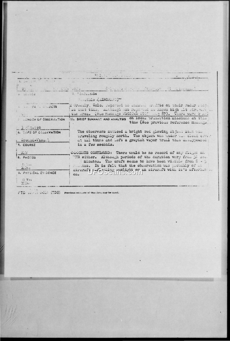 This document details a UFO sighting reported on August 22, 1967, in Colorado Springs, Colorado. The witnesses, a family group, observed a bright, football-shaped object with a red and silver glow moving in a north-northwesterly direction. The object was described as having a unique, puffy, wavy exhaust trail that shifted from gray to white before disappearing. The observation lasted approximately two to three minutes. The witnesses reported the event to NORAD and subsequently provided detailed accounts via Air Force questionnaires. The Air Force conducted an investigation, contacting the 4600th Air Base Wing at Ent Air Force Base. Official inquiries to the Denver Air Route Traffic Control Center (ARTCC) and the radar site at Greeley, Colorado, confirmed that there was no unusual radar traffic or known flight plans in the area at the time of the sighting. The investigation concluded that the object's characteristics, particularly the exhaust trail, were inconsistent with conventional aircraft. Despite the investigation, the official conclusion reached by the Air Force, as stated by Lt. Colonel Mac Vickrey, was that the cause of the sighting remained unknown.