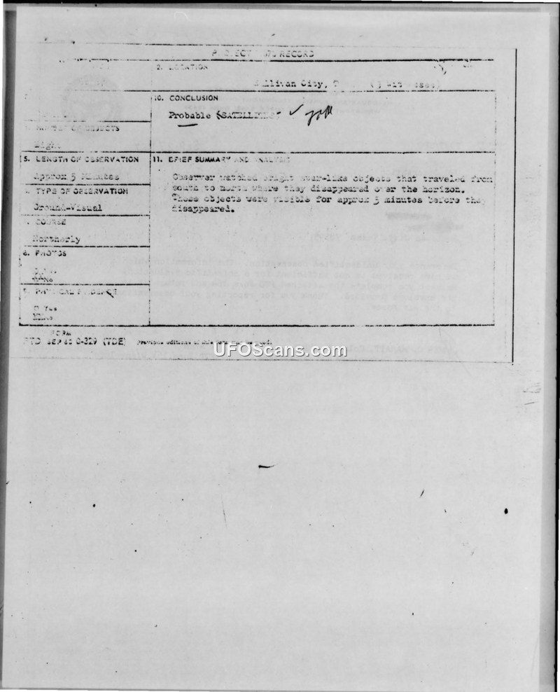 A September 1967 UFO sighting in Sullivan City, Texas, involving two star-like objects, was investigated by the Air Force and tentatively identified as satellites. The Air Force requested further documentation from the witness to complete their evaluation.