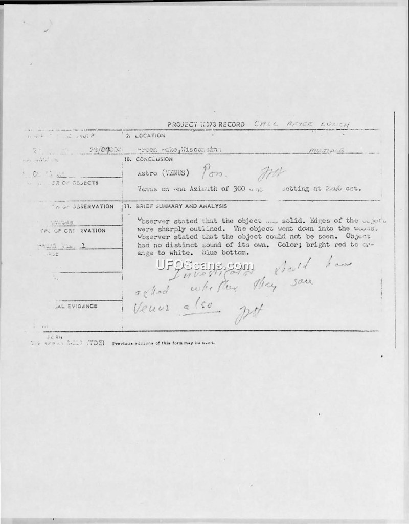 A 1967 sighting report from Green Lake, Wisconsin, describes an object observed for 15 minutes that was officially identified by the Air Force as the planet Venus. The report includes witness testimony, sketches, and correspondence with the Project Blue Book office.