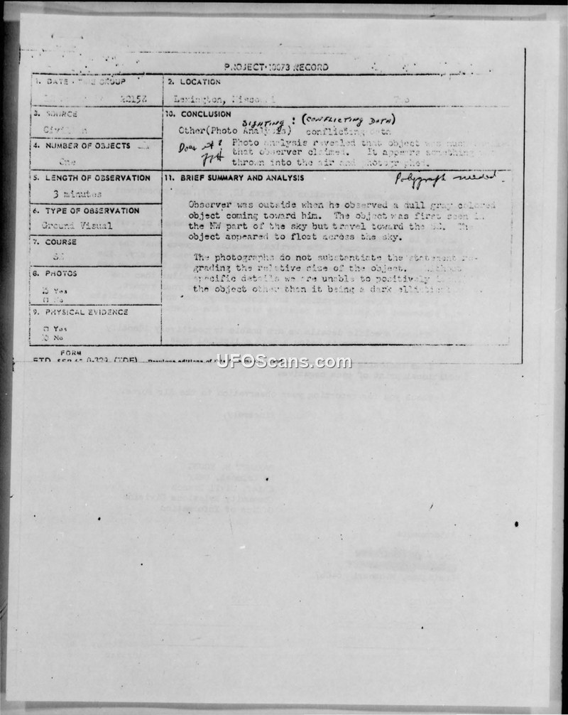 A 15-year-old witness reported a UFO sighting in Lexington, Missouri, in 1967. Air Force photographic analysis determined the images were likely faked or misinterpreted due to camera movement, concluding the object was much smaller than claimed.