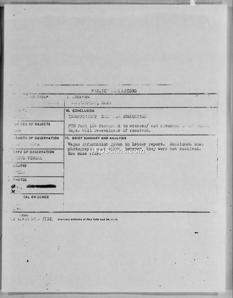 A witness in Northampton, Massachusetts, reported observing disc-shaped lights on March 30, 1967. The Air Force requested further documentation and photographs, but the witness failed to respond, resulting in a case closure due to insufficient data.