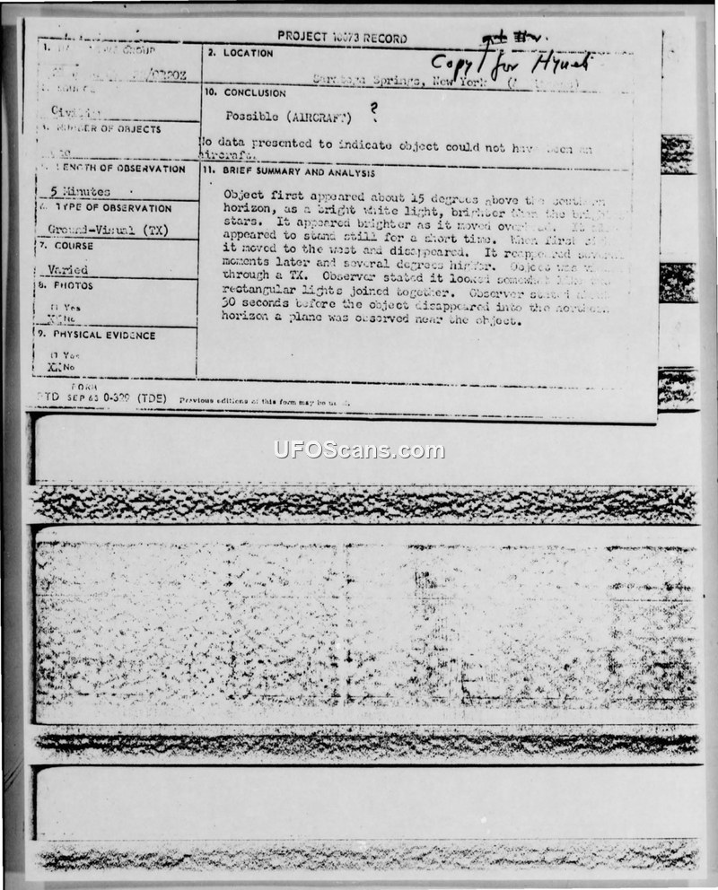 A 12-year-old witness reported a bright, rectangular-shaped light in Saratoga Springs, NY, on June 21, 1967. The Air Force evaluated the report and concluded it was a possible aircraft.