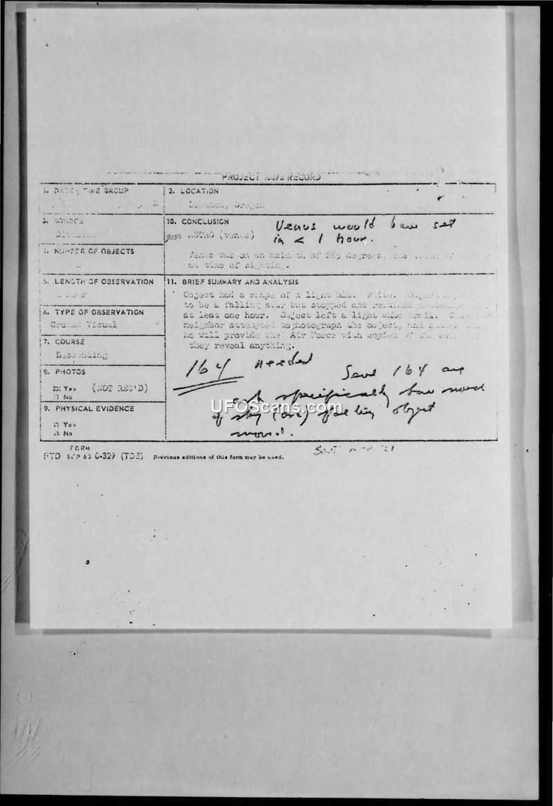 This document contains a series of communications regarding a UFO sighting reported in Lebanon, Oregon, on June 30, 1967. The witness, residing at 575 Hillview Road, reported observing an object that initially appeared to be a falling star but then stopped and remained motionless for at least one hour. The object was described as having the shape of a light bulb, a light blue color, and a light white trail. The witness reported that the object appeared larger and brighter than a star. The report was processed by the 26th NORAD/Air Division and forwarded to the Foreign Technology Division at Wright-Patterson Air Force Base. The official conclusion reached by the Air Force was that the object was the planet Venus, noting that Venus would have set in less than one hour and was positioned at an azimuth of 285 degrees. The staff intelligence officer at the 26th NORAD/Air Division explicitly ruled out the possibility of the object being a plastic bag due to its stationary nature and confirmed there was no weather balloon activity in the vicinity. The witness had attempted to photograph the object and indicated a willingness to share the results with the Air Force if the images were revealing. The file includes a formal letter from Colonel James C. Manatt of the Foreign Technology Division, dated June 29, 1967, informing the witness that the initial information provided was insufficient for a scientific investigation and requesting the completion of an AF Form 117.