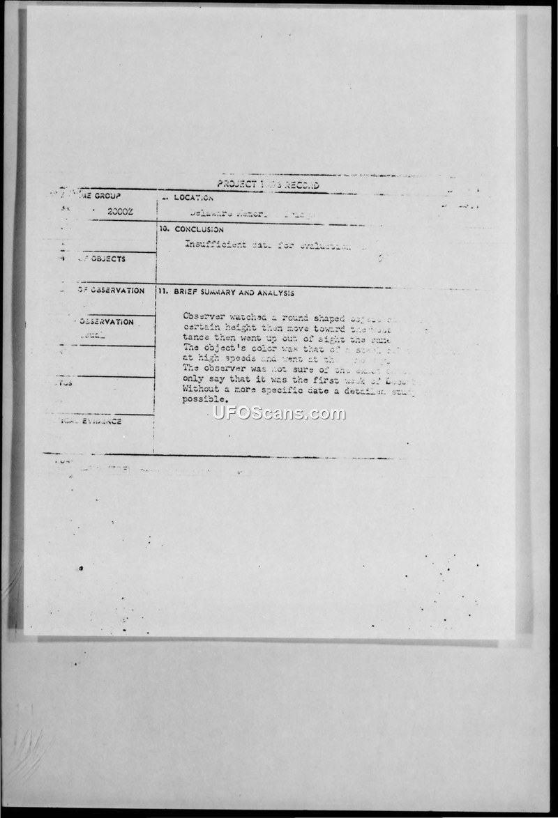 A witness reported a round, steel-colored object moving at high speed near the Delaware Memorial Bridge in January 1967. The Air Force concluded the report contained insufficient data for a formal evaluation.
