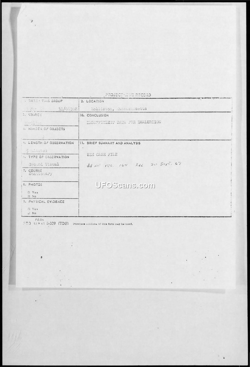A 1967 UFO sighting report from Holliston, Massachusetts, involving two round, metallic objects. The Air Force concluded there was insufficient data for a scientific evaluation.