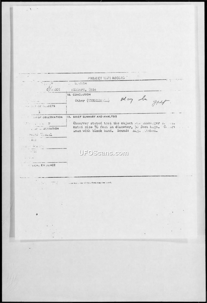 A 14-year-old boy reported a UFO landing and contact with beings in Hilliard, Ohio, in 1967. Air Force investigators found no physical evidence and concluded the report was a fabrication.