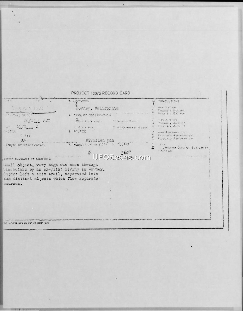 A former pilot reported observing an unidentified object in Downey, California, on August 8, 1952, which appeared to release a second object. The report was filed with the Civilian Saucer Investigation and subsequently processed under Project 10073.