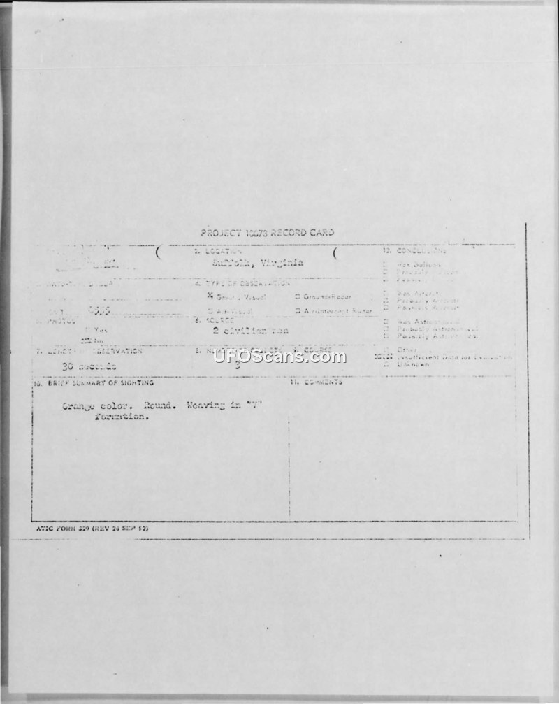 On August 13, 1952, at 0555 Z, two civilian witnesses observed three unidentified objects over Suffolk, Virginia. The objects were described as round and orange in color, flying in a 'V' formation. The witnesses reported that the objects were moving at a very high speed, weaving back and forth from the southeast to the north. The observation lasted for approximately 30 seconds. The report explicitly notes that there was no sound, no trail or exhaust, and no visible propulsion system. The witnesses, identified as a man and a doctor, were contacted regarding the event. Military authorities, including the 771st AC&W Squadron and the 26th Air Division, processed the report. A check with Langley AFB yielded no additional information. The official conclusion recorded on the Project 10073 record card is that there was insufficient data for a definitive evaluation.