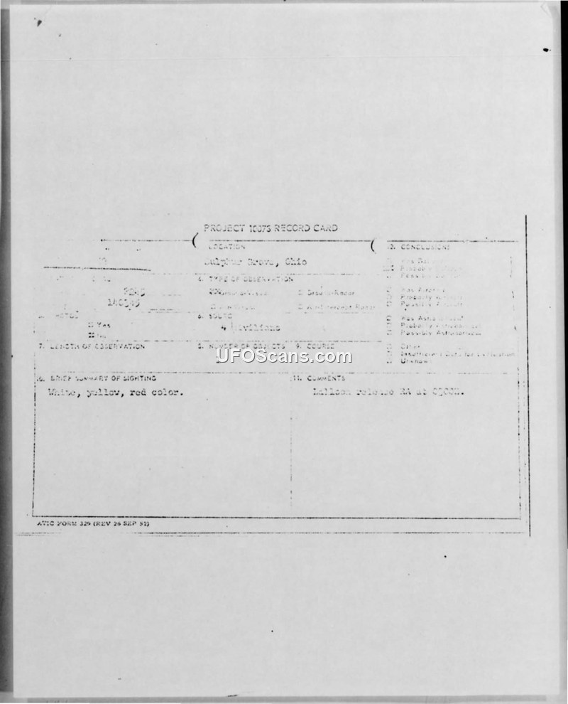 A sighting report from August 13, 1952, in Sulphur Grove, Ohio, involving a multi-colored object observed at 3,000 feet. The report was compiled by ATIC under Project 10073.