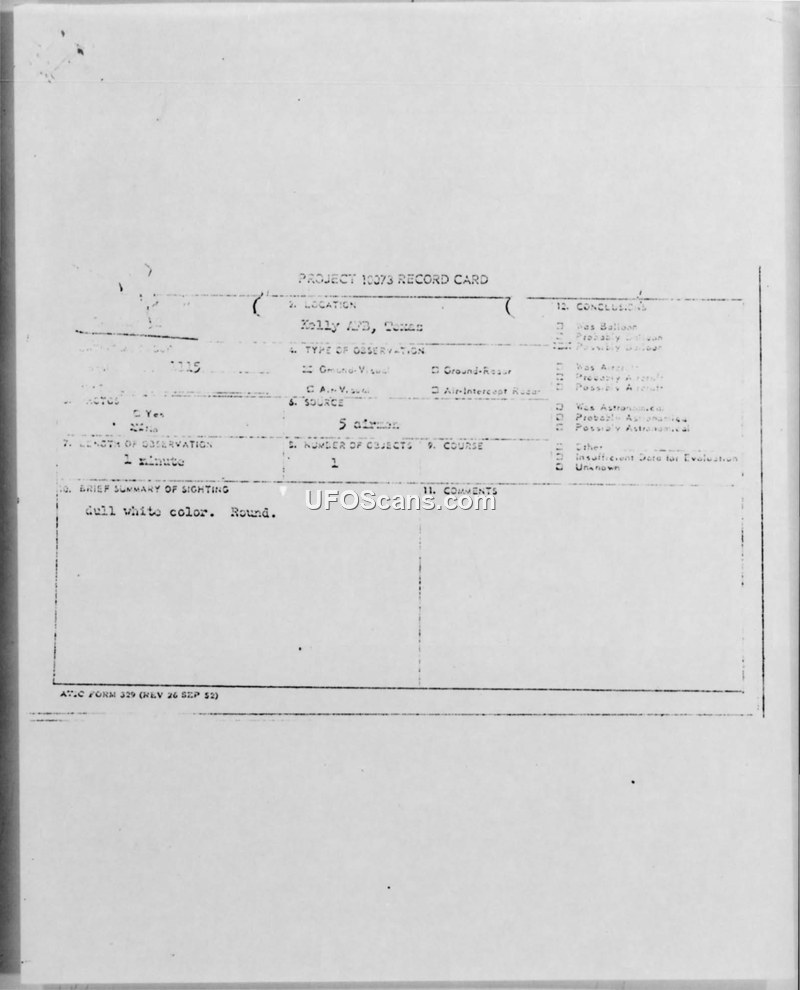 Project 10073 Record Card and Observer Questionnaires — Kelly AFB, Texas, August 1952