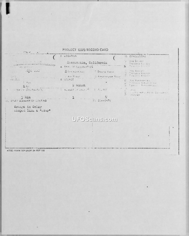 A report detailing a 1952 sighting of an orange, star-shaped object over Sacramento, California, observed by two women for three minutes.