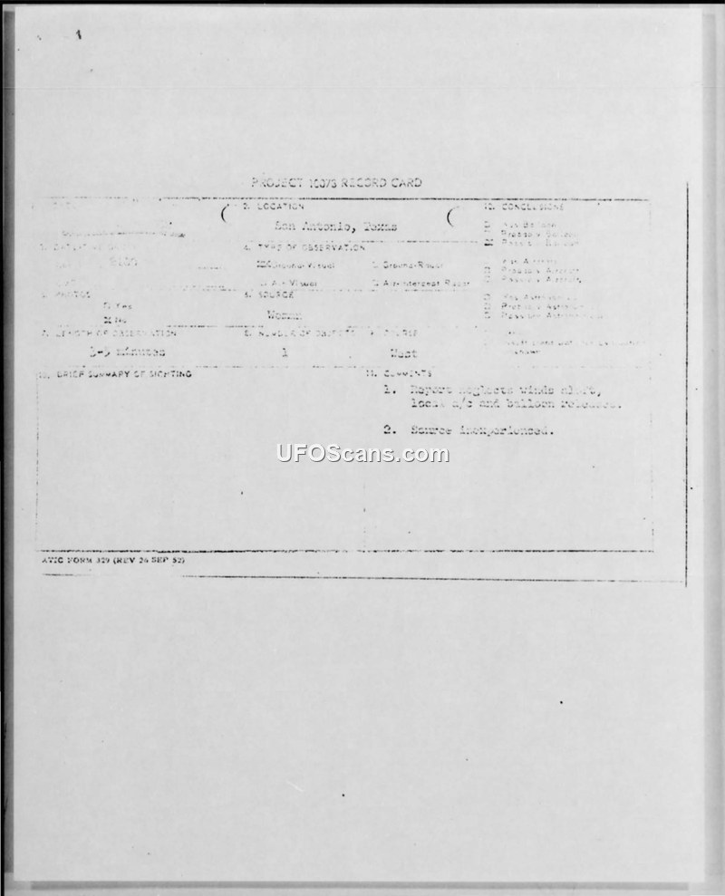 Project 10073 Record Card and Air Intelligence Information Report — San Antonio, Texas, 20 August 1952