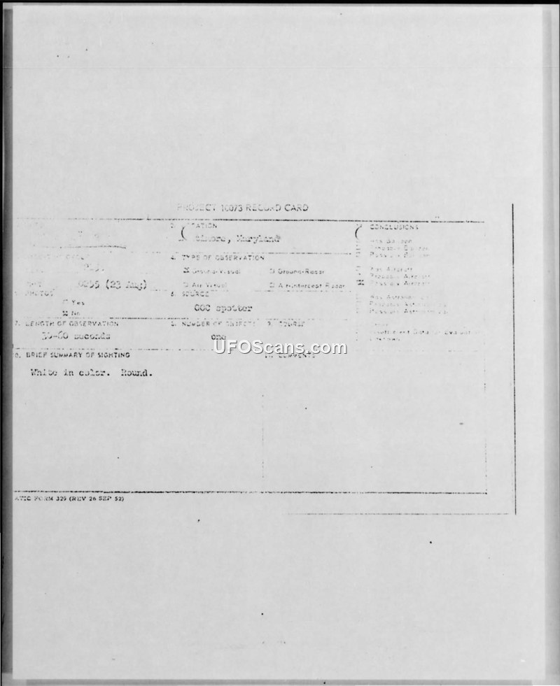 A Ground Observer Corps volunteer reported a motionless, white, round light over Baltimore on August 22, 1952. The Air Force evaluated the report as potentially being a balloon, noting discrepancies in the observer's timing.