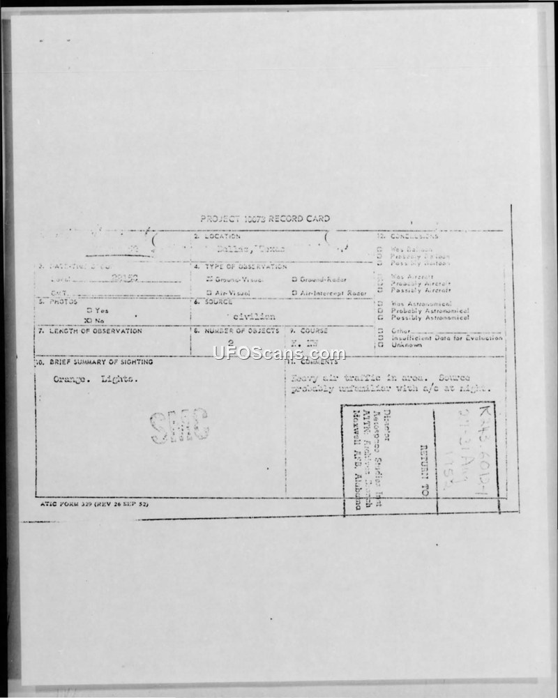 A 1967 UFO sighting in Dallas, Texas, was investigated by Project Blue Book. The witness later admitted the object was a kite used by friends to play a prank.