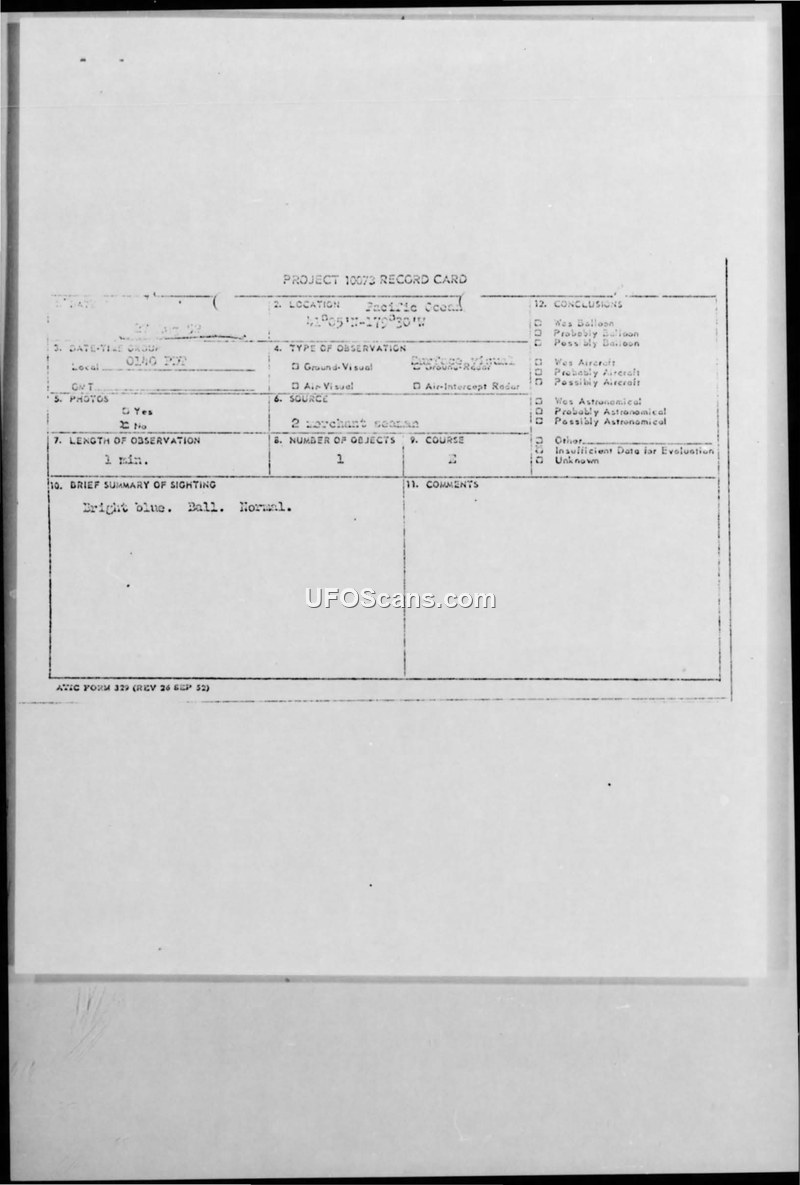 A report detailing a sighting of a bright blue, ball-shaped object by two merchant seamen in the Pacific Ocean on August 27, 1952. The object moved from west to east at an estimated 40,000 feet with no sound or exhaust.