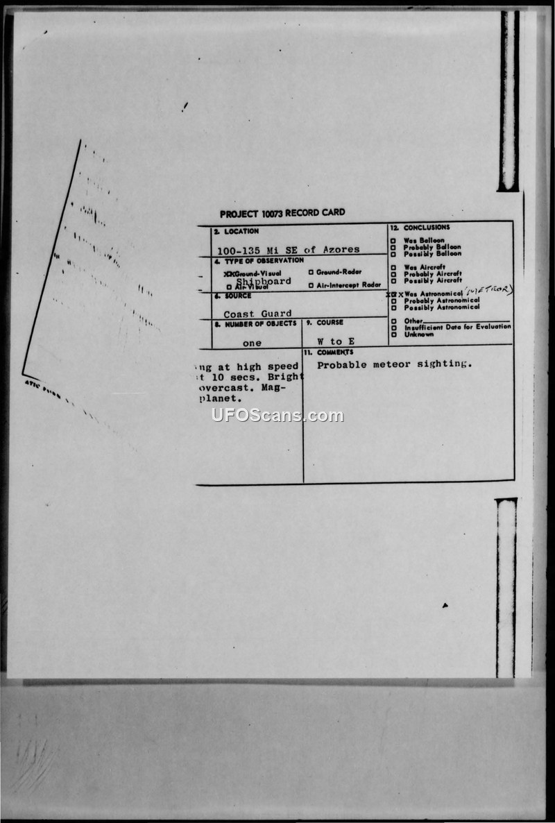 A US Coast Guard cutter reported a bright, high-speed object near the Azores. Military intelligence evaluated the sighting as a probable meteor or bolide.