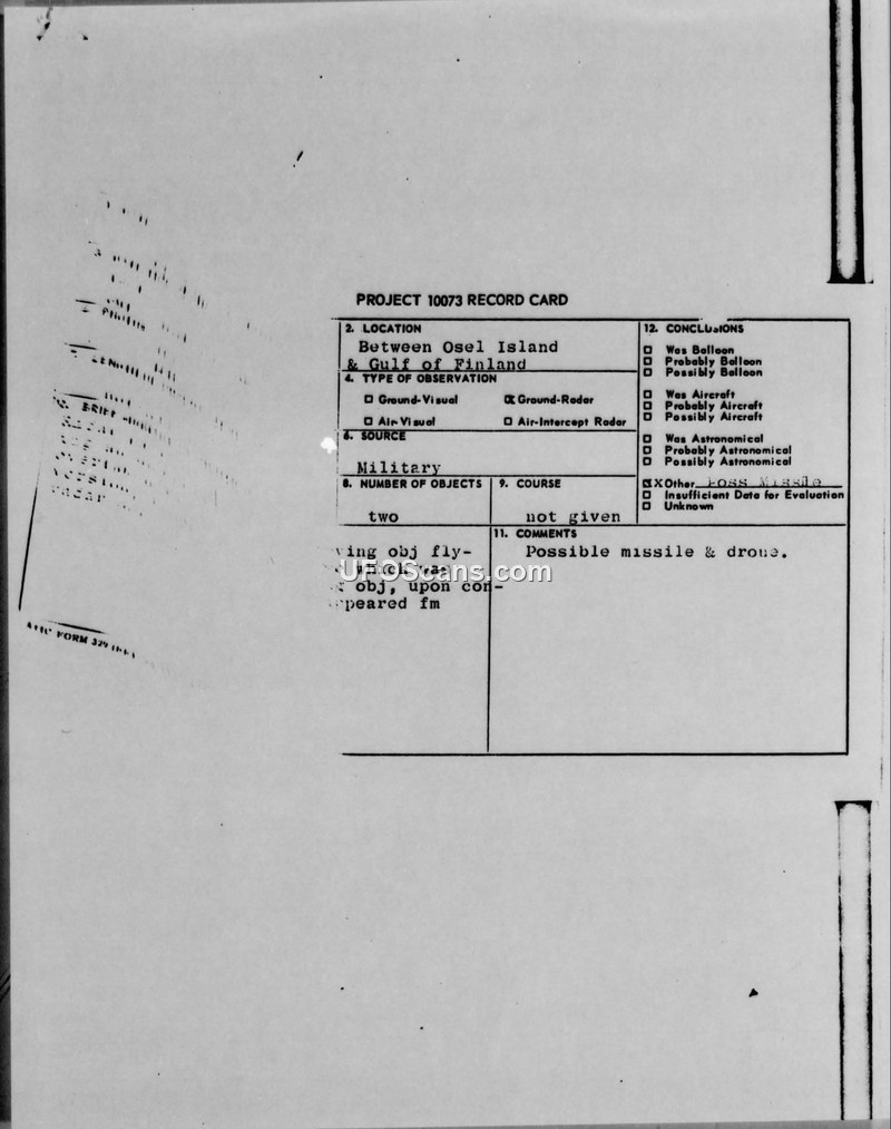 A military radar sighting of two objects near Osel Island on August 11, 1958, was assessed as a possible missile and drone. The report was circulated among various US military commands.