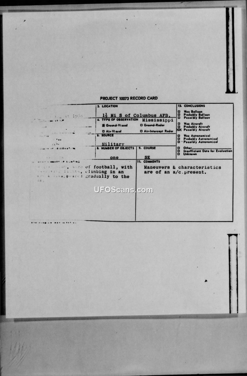 A 1958 sighting report from Columbus AFB describes a football-sized, bluish, revolving object observed for 30 seconds. The official conclusion attributed the object's behavior to an aircraft.
