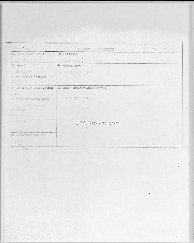 A witness in Los Gatos, California, reported a bowl-shaped UFO in May 1967. The Air Force responded that the provided information was insufficient for a scientific evaluation.