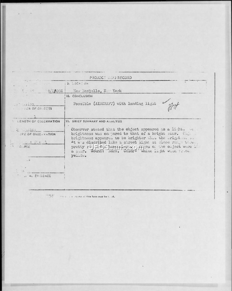 A 17-year-old student in New Rochelle, New York, reported a series of sightings of a bright, multi-part light in April and May 1967. Project Blue Book investigated the report and concluded the object was likely an aircraft with a landing light.