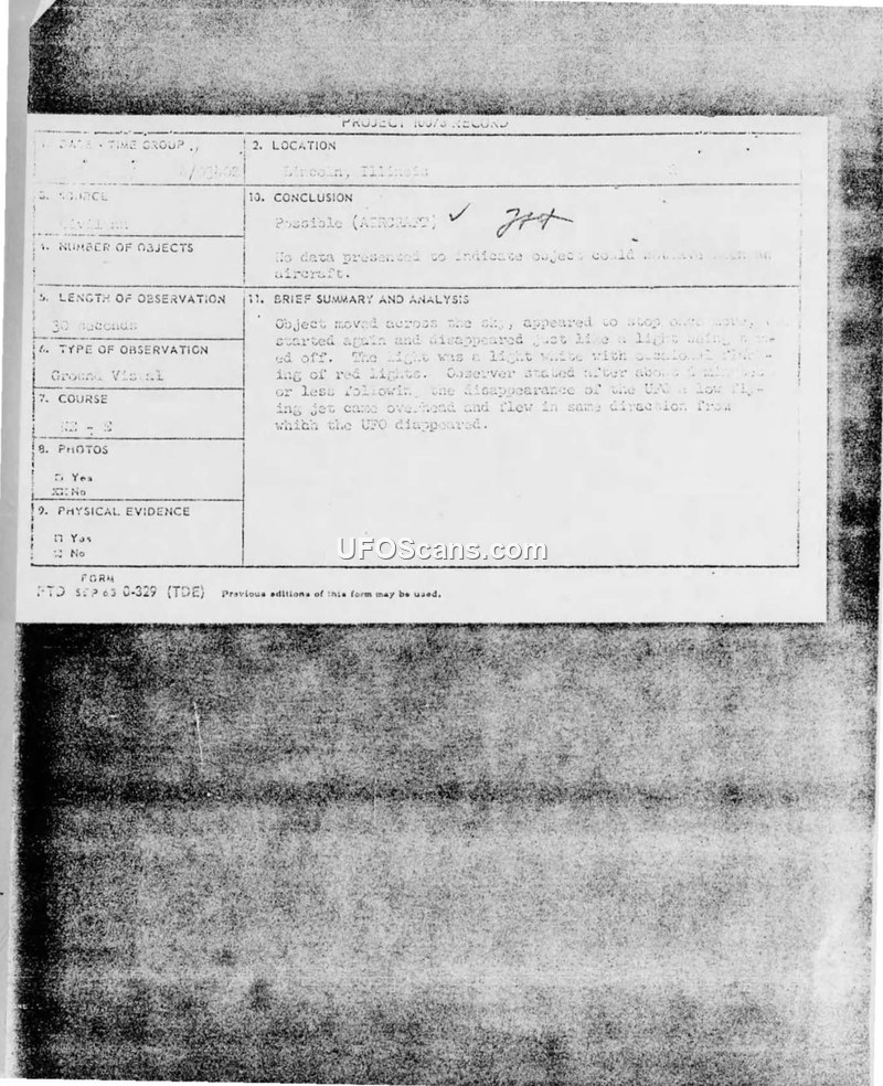 On June 3, 1967, at approximately 9:45 P.M., a 15-year-old witness and their 11-year-old sister observed an unidentified aerial phenomenon in the sky over Lincoln, Illinois. The primary witness, who identified as a student of the U.F.O. mystery, described the object as a fairly bright, consistent white light with occasional red flashes. According to the witness, the object appeared directly overhead, moved across the sky, stopped, and then continued to move until it was low in the north-east sky, where it vanished as if a light had been turned off. The witness noted that approximately five minutes after the disappearance, a low-flying jet appeared and flew in the same direction from which the object had vanished. The witness reported the event to an Arthur W. Bree on the same day. Following the report, the Department of the Air Force, specifically the Foreign Technology Division at Wright-Patterson Air Force Base, sent a letter to the witness dated June 21, 1967, stating that the information provided was insufficient for a scientific evaluation and requesting the completion of an FTD Form 164. The witness completed the questionnaire on June 22, 1967, providing details on the sighting, including a sketch of the object's path and a comparison of its appearance to a light bulb at a distance. The official conclusion recorded on the project record form noted that there was no data presented to indicate the object could have been an aircraft, though a handwritten note on the correspondence suggests 'Aircraft (possible)' was considered.