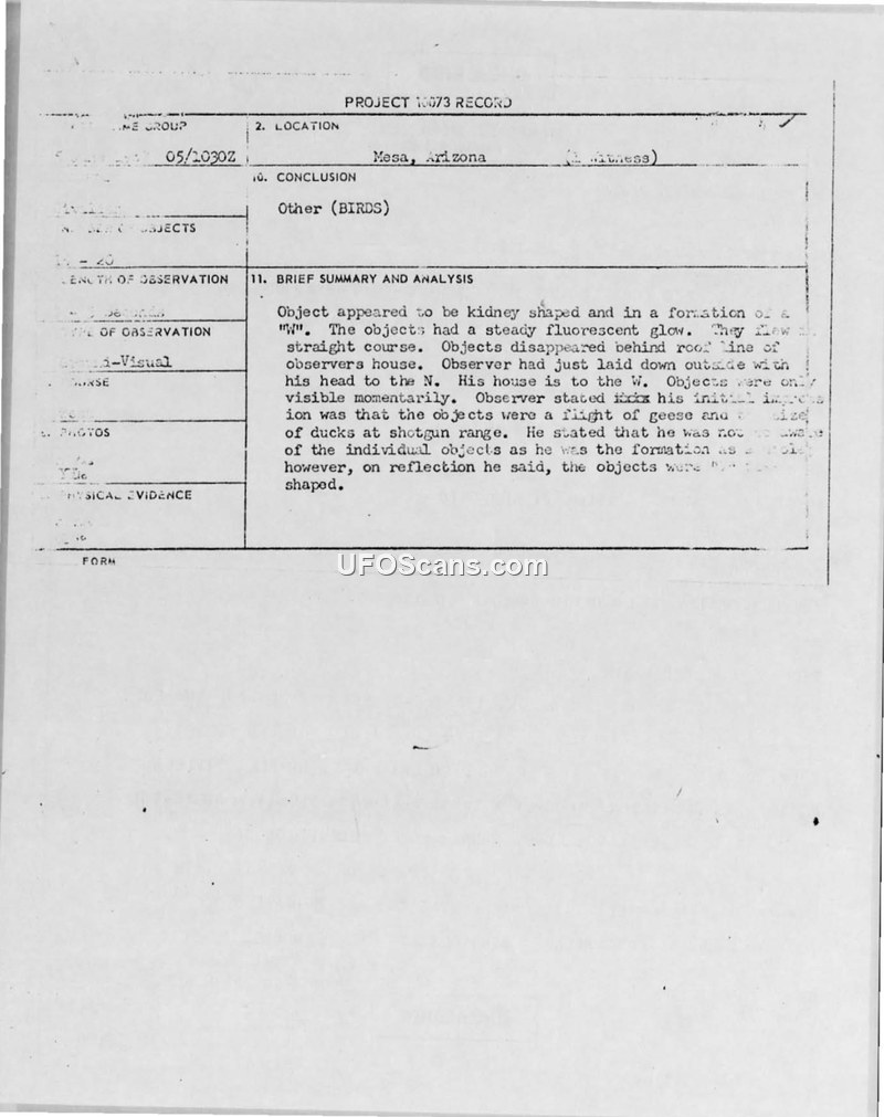 This document is an official Air Force incoming message regarding a UFO sighting in Mesa, Arizona, in June 1967. The observer, a 56-year-old male, reported seeing 15 to 20 white, kidney-shaped objects with a steady fluorescent glow flying in a 'W' formation. The sighting lasted only two to three seconds. The observer was sleeping outside on a cot due to the heat when he witnessed the objects moving in a straight line at an angle of elevation of approximately 85 degrees before they disappeared behind the roofline of his house. Initially, the observer believed the objects were a flight of geese or ducks, but upon reflection, he described them as disk-shaped. The Air Force investigation considered four potential explanations: birds or bats reflecting light, a meteor shower, a tanker aircraft with refueling lights on, or a large aircraft with landing lights. The report concludes that the fourth option—a large aircraft with landing lights—is the most plausible explanation for the event.