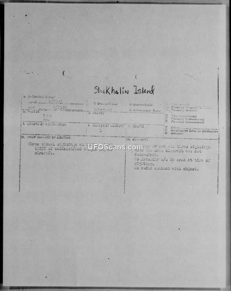 The proximity of Sakhalin Island to the areas of sighting, increase the possibility of the aircraft being of Soviet origin. Slow flying aircraft at low altitude could conceivably escape detection by EW Radar.