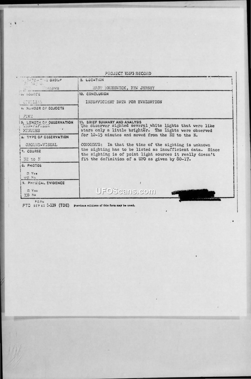 A 1968 report of five unidentified lights in East Brunswick, New Jersey, was evaluated by the Air Force as having insufficient data. The witness reported physical symptoms and animal reactions during the 10-15 minute observation.