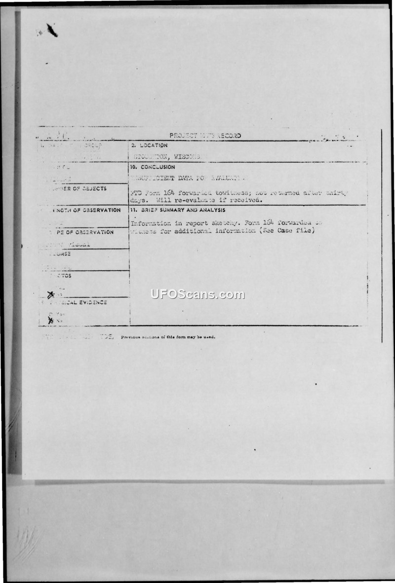 Three civilians reported a hovering, glowing oval object in Stoughton, Wisconsin, on March 2, 1967. The Air Force investigation concluded there was insufficient data to evaluate the sighting after the witnesses failed to provide follow-up information.